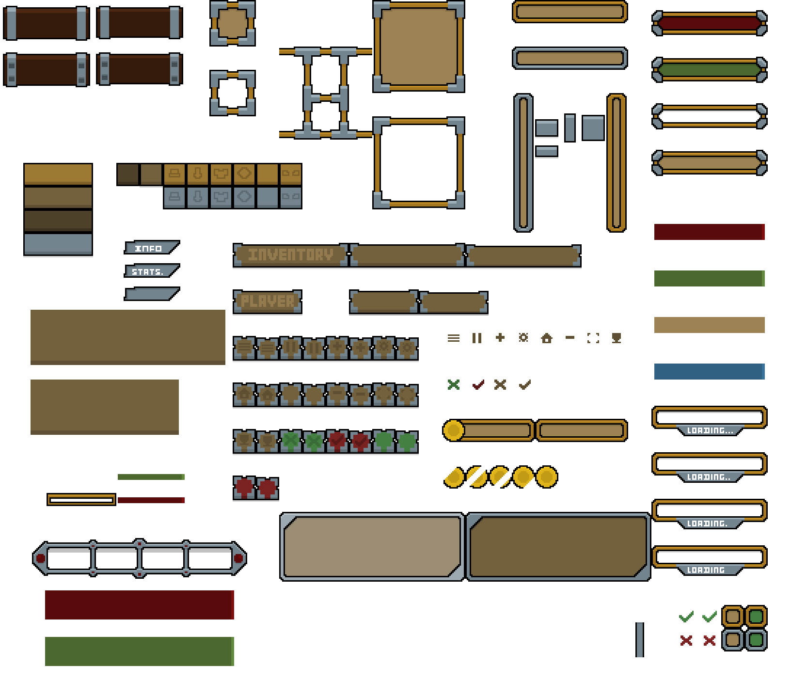 A small collection of pixel art UI elements for Simple Fantasy. The UI is designed so you can expand or customize the background using a tilemap, making it easy to create your own layouts for inventories or other interfaces